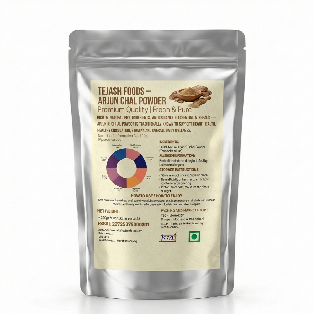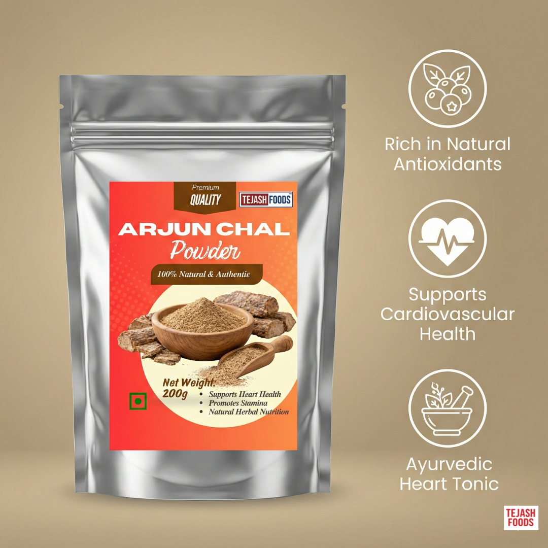 Tejash Foods Arjun Chhal Powder is a premium quality product made from carefully selected arjun tree bark (Terminalia arjuna). The bark is hygienically cleaned, naturally dried, and finely ground to preserve its natural properties, color, and purity. This powder is 100% pure and natural, with no added artificial colors, preservatives, or chemicals.