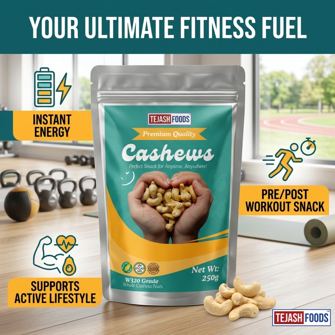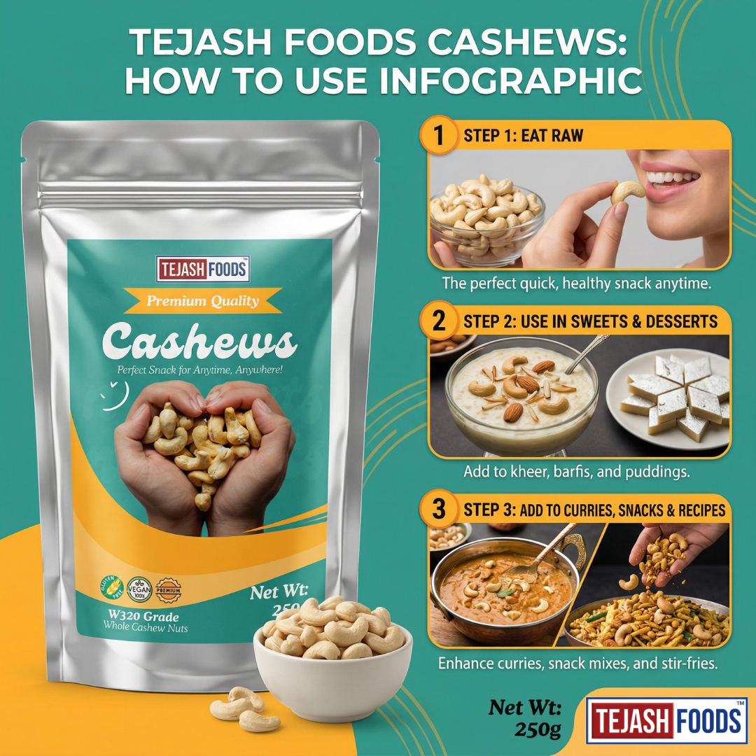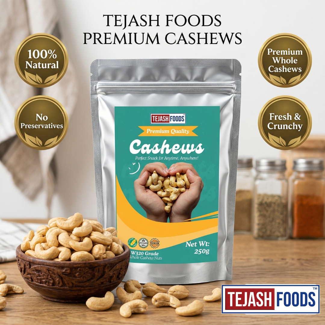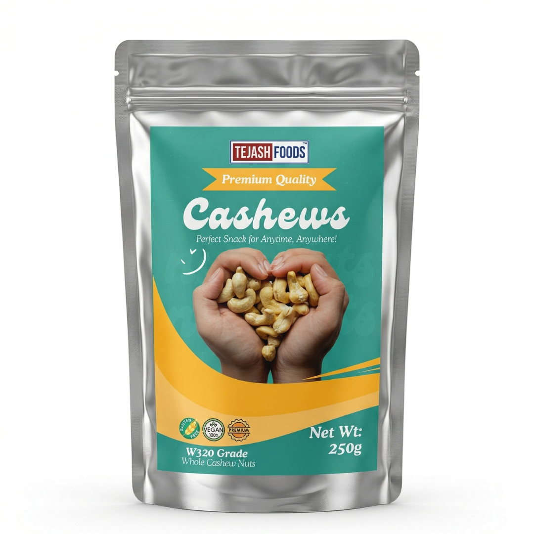 Tejash Foods Whole Cashew Nuts (Kaju) W320 | 100% Natural | No Preservatives | 250g is carefully processed using high-quality raw materials without harmful additives or artificial colors.